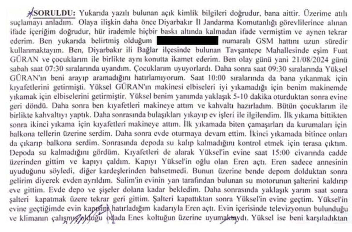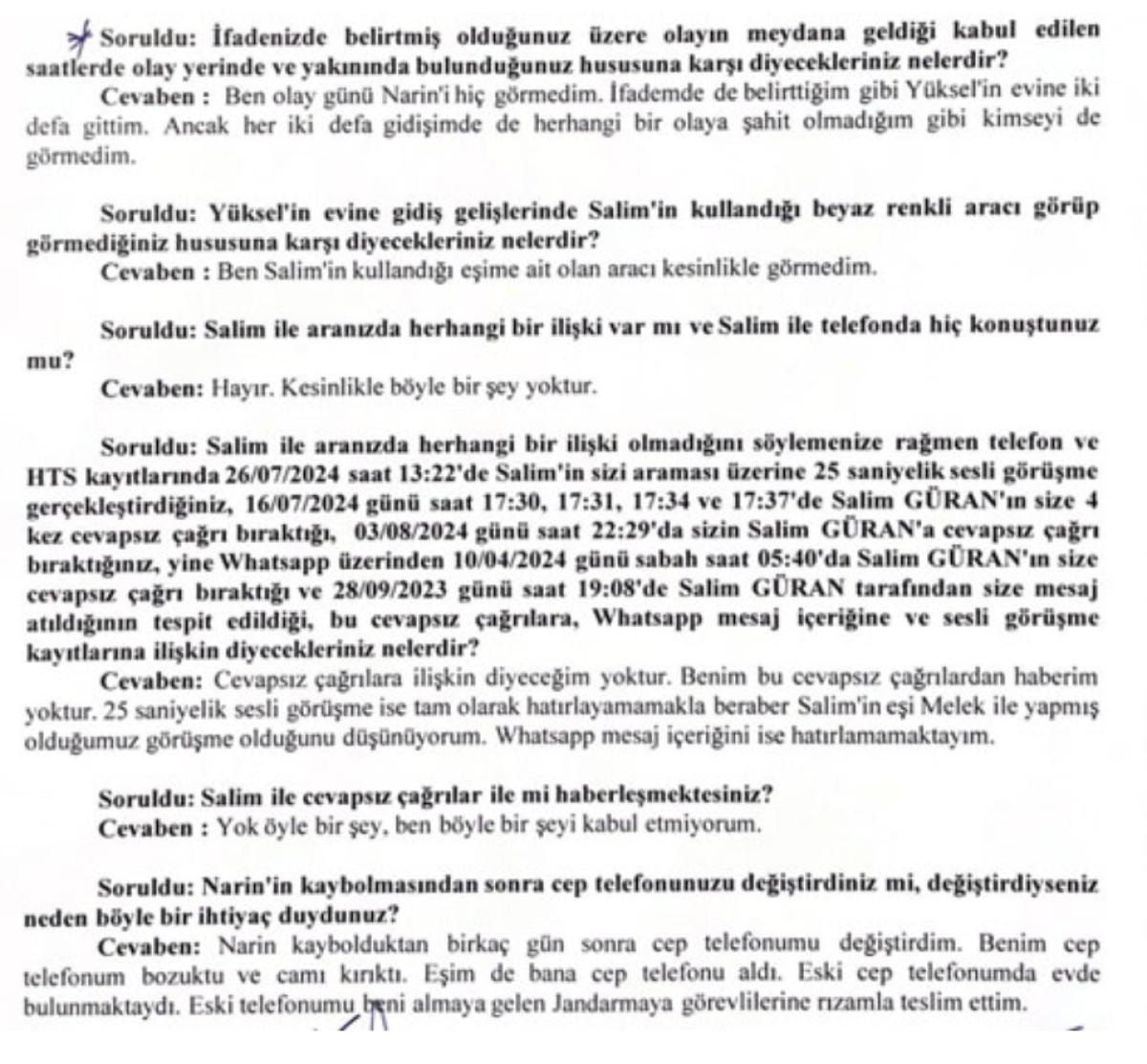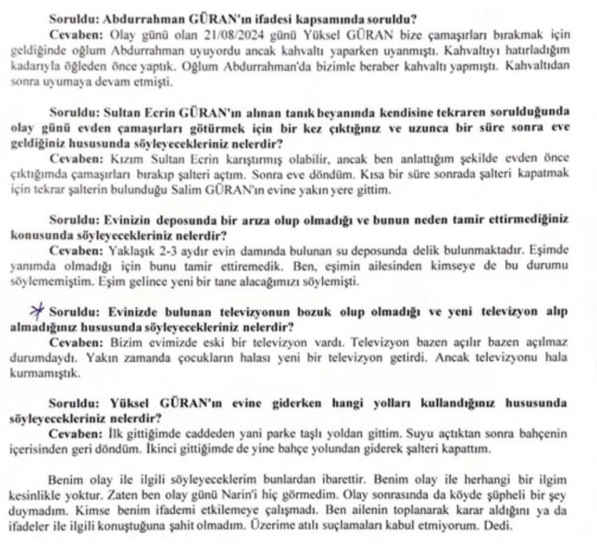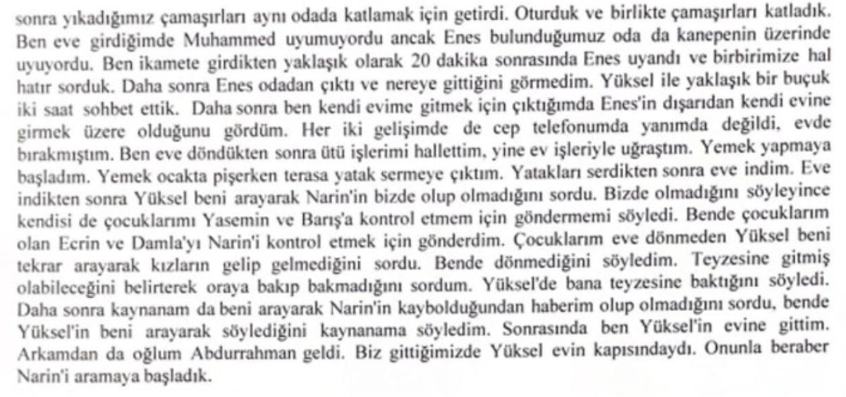 Narin kaybolduktan sonra telefonunu değiştirdiğini söyleyen Hediye Güran, savcılıktaki ifadesinde "Ben olay günü Narin'i hiç görmedim. İfademde de belirttiğim gibi Yüksel'in evine iki defa gittim. Ancak her iki defa gidişimde de herhangi bir olaya şahit olmadığım gibi kimseyi de görmedim. Ben Salim'in kullandığı eşime ait olan aracı kesinlikle görmedim." dedi.