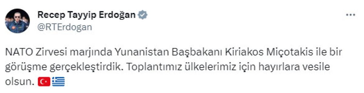 "NATO Zirvesi marjında Yunanistan Başbakanı Kiriakos Miçotakis ile bir görüşme gerçekleştirdik. Toplantımız ülkelerimiz için hayırlara vesile olsun."