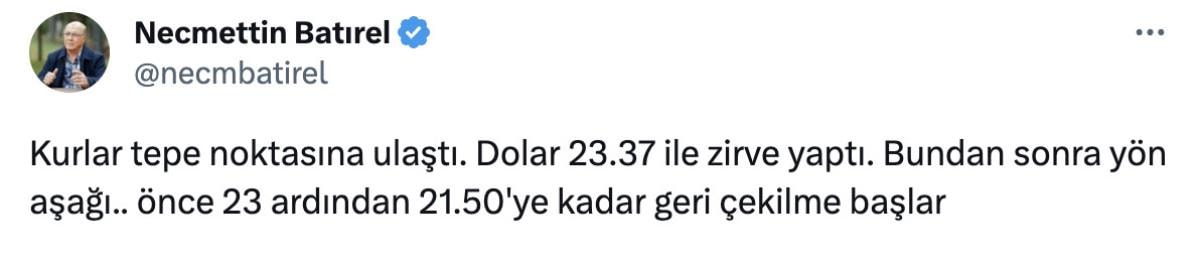 Daha önce döviz artışının yaşandığı dönemde yükselişe karşı "Şakkadanak dolar satarım" önerisinde bulunan Batırel, sosyal medya hesabından yeni bir öngörüsünü duyurdu.