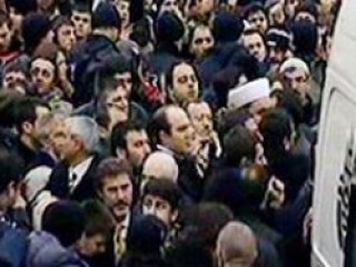 Saat 12.51: Başbakan Erdoğan, Cumhurbaşkanı Abdullah Gül, Meclis Başkanı Mehmet Ali Şahin Erbakan'ın tabutu başına gitmekte büyük zorluk çekiyor..