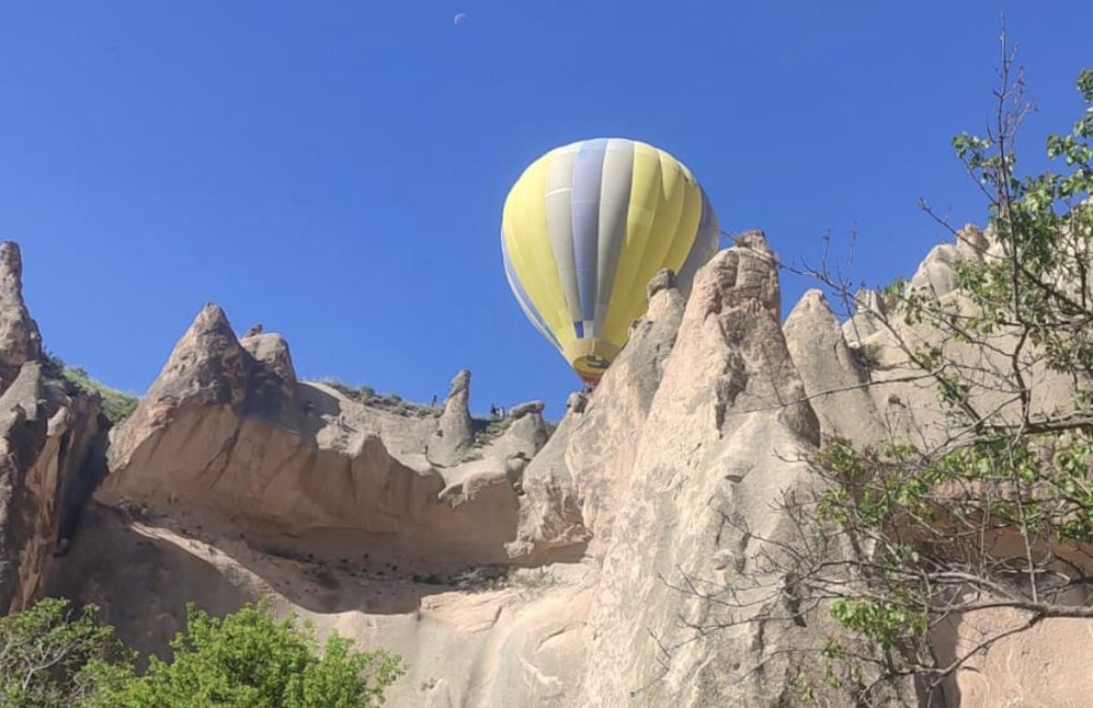 Nevşehir Kapadokya'da sabah saatlerinde havalanan turistlerin bulunduğu sıcak hava balonu, bir süre sonra henüz bilinmeyen nedenle kayalıklara zorunlu iniş yaptı.