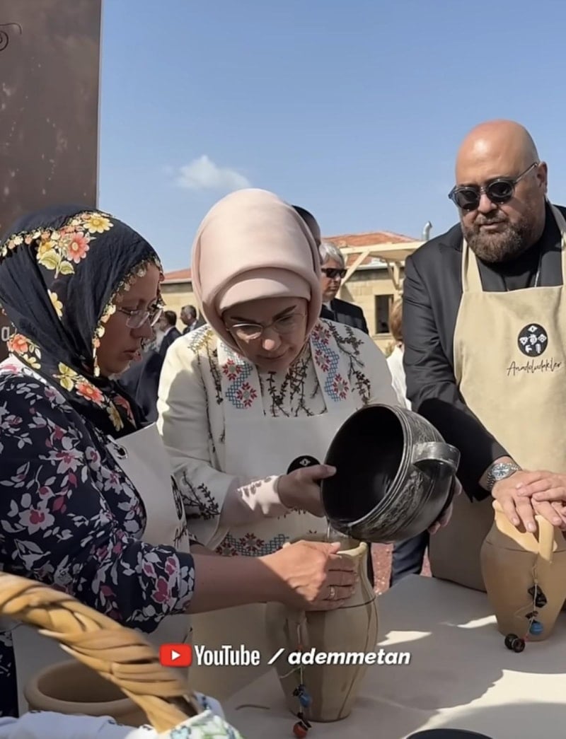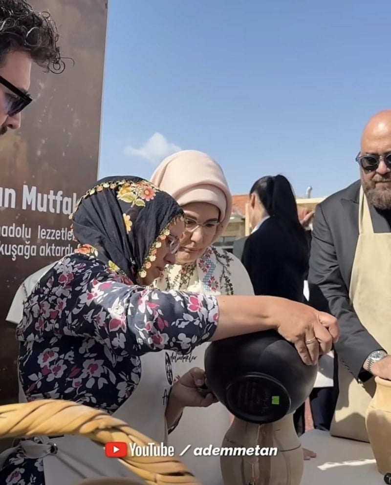 Cumhurbaşkanı Recep Tayyip Erdoğan'ın eşi Emine Erdoğan, Türk Mutfağı Haftası kapsamında geldiği Nevşehir'de, kadınlarla buluştu. Yaprak sarması üzerine yapılan sohbette ise renkli görüntüler ortaya çıktı.
