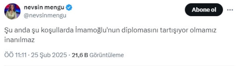 Mengü X hesabından yaptığı açıklamada, "Şu anda şu koşullarda İmamoğlu'nun diplomasını tartışıyor olmamız inanılmaz." ifadelerini kullandı.