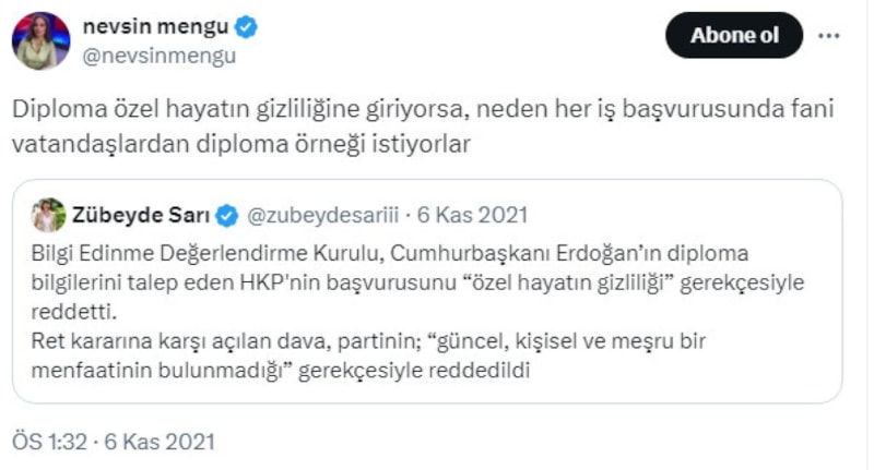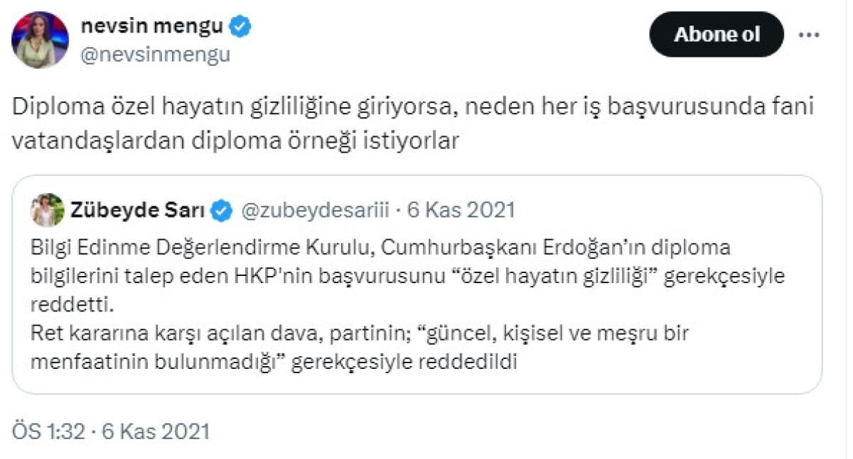 Mengü o dönemde yaptığı bir paylaşımda, "Diploma özel hayatın gizliliğine giriyorsa neden her iş başvurusunda fani vatandaşlardan diploma örneği istiyorlar." ifadelerini kullanmıştı.