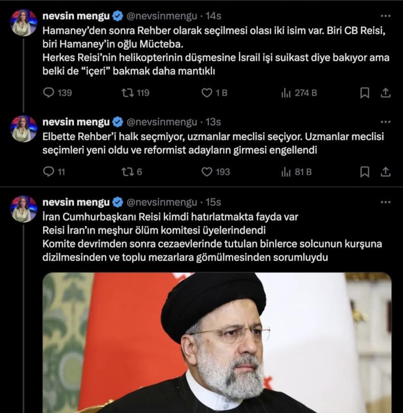 İran Dini Lideri Ayetullah Ali Hamaney'in yerine geçmesi beklenen Reisi'nin ölümüyle Hamaney'in oğlu olan Mücteba'nın önünün açıldığına vurgu yapan Mengü, "Hamaney’den sonra Rehber olarak seçilmesi olası iki isim var. Biri CB Reisi, biri Hamaney’in oğlu Mücteba. Herkes Reisi’nin helikopterinin düşmesine İsrail işi suikast diye bakıyor ama belki de “içeri” bakmak daha mantıklı." ifadelerini kullandı.
