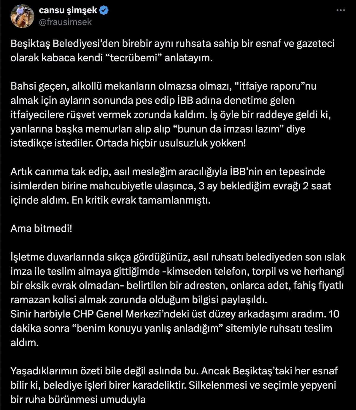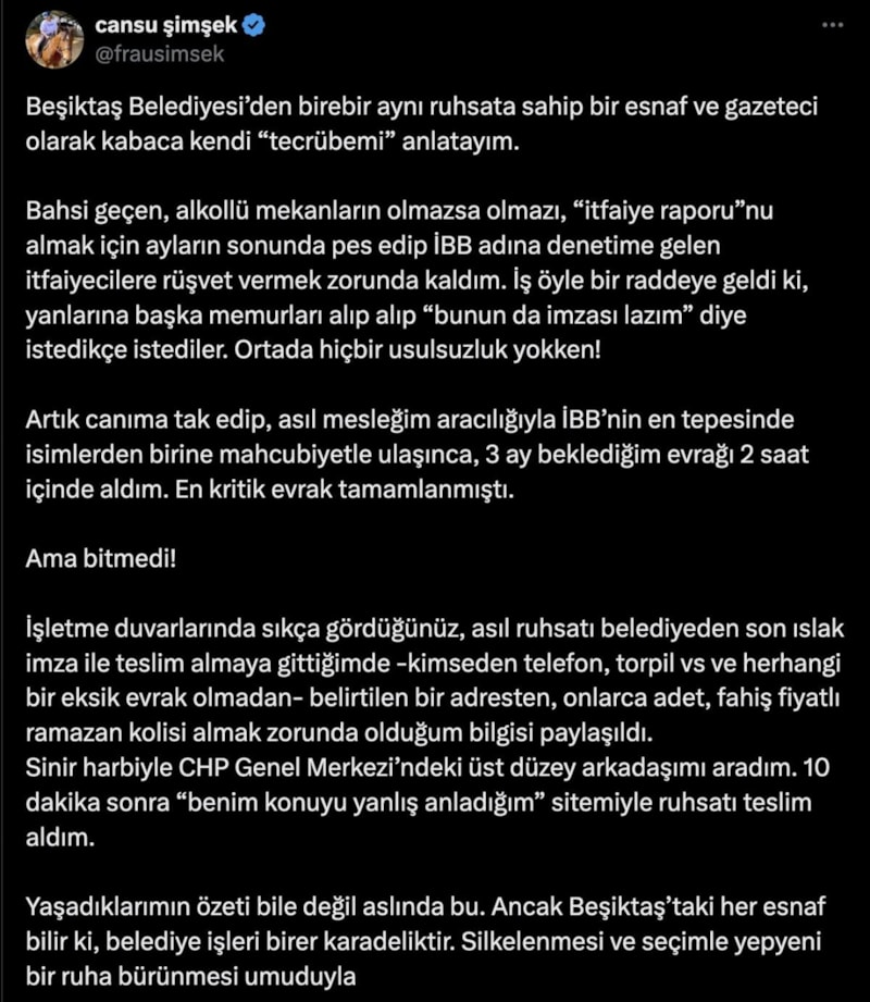 Beşiktaş'ta bir işletme sahibi de olan Şimşek, X hesabından yaptığı paylaşımda, 2020 yılında işletme sahibi olduğu mekanı için 'itfaiye ruhsatı' alması gerektiğini fakat aylar süren çabalarının sonucunda ruhsatı alamadığını, bu yüzden İBB adına denetime gelen itfaiyecilere rüşvet vermek zorunda kaldığını söyledi.