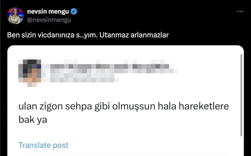 Kullanıcının paylaşımını alıntılayan Mengü, "Ben sizin vicdanınıza s…yım. Utanmaz arlanmazlar" ifadelerini kullandı.