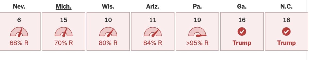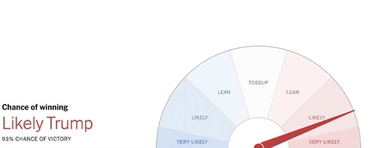 Güncel anket verileri, şimdiye kadar bildirilen oylar ve kalan oylardan çıkması tahmin edilen sonuca ilişkin anlık bildirim sağlayan NY Times, kazananın yüzde 95 ihtimalle Donald Trump olacağını bildirdi.