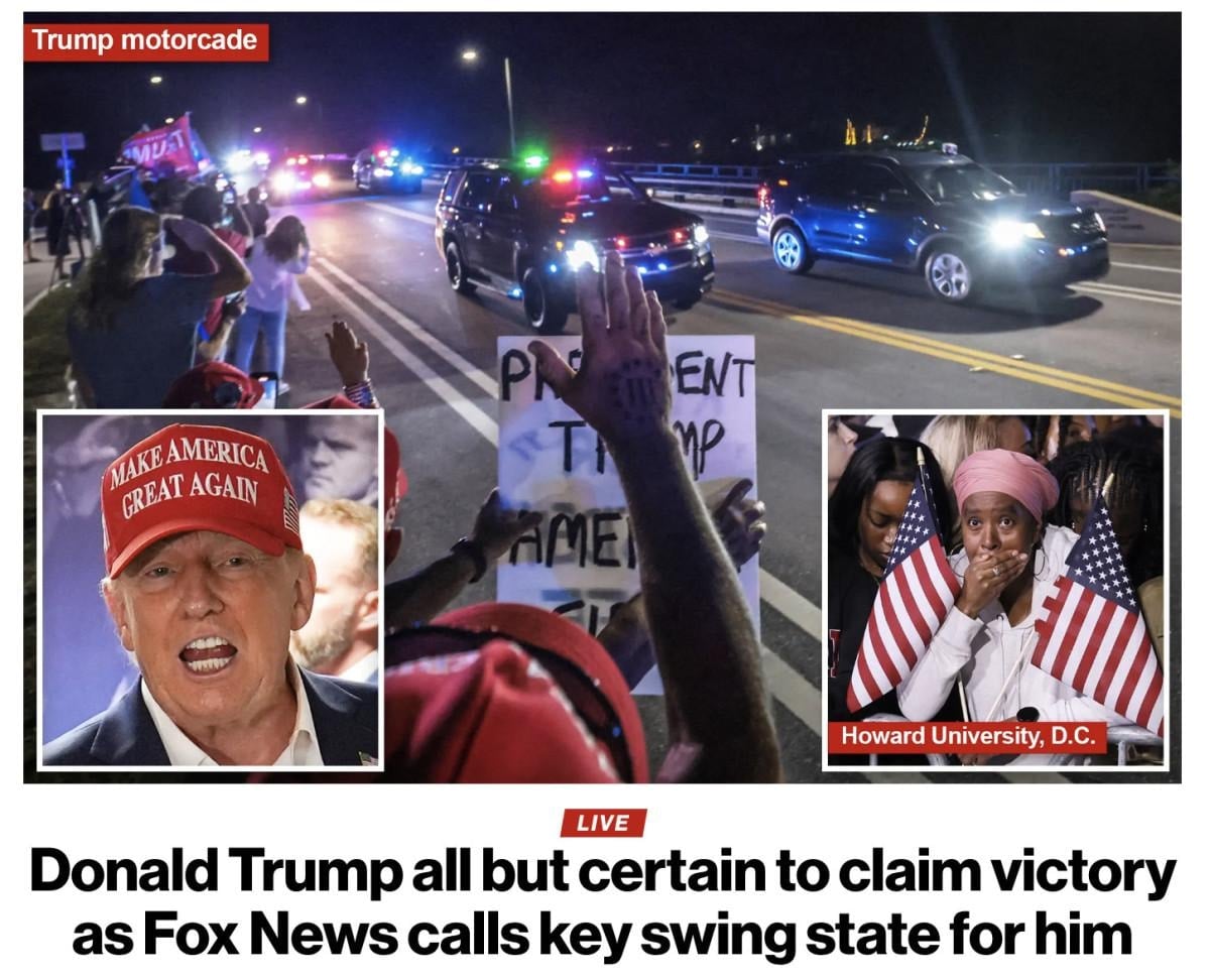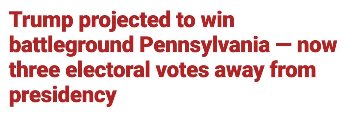 Başkanlık seçiminde Demokrat eğilim gösteren FOX NEWS, seçimin kilit eyaletlerinden biri olan Pensilvanya'yı Trump'ın kazanacağını ileri sürerek, "Trump'ın Pennsylvania'daki savaş alanını kazanması öngörülüyor - Şimdi başkanlıktan üç oy uzakta" başlığını attı.