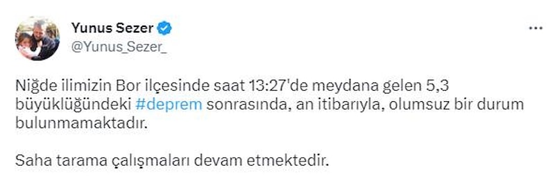 Niğde ilimizin Bor ilçesinde saat 13:27'de meydana gelen 5,3 büyüklüğündeki deprem sonrasında, an itibarıyla, olumsuz bir durum bulunmamaktadır.