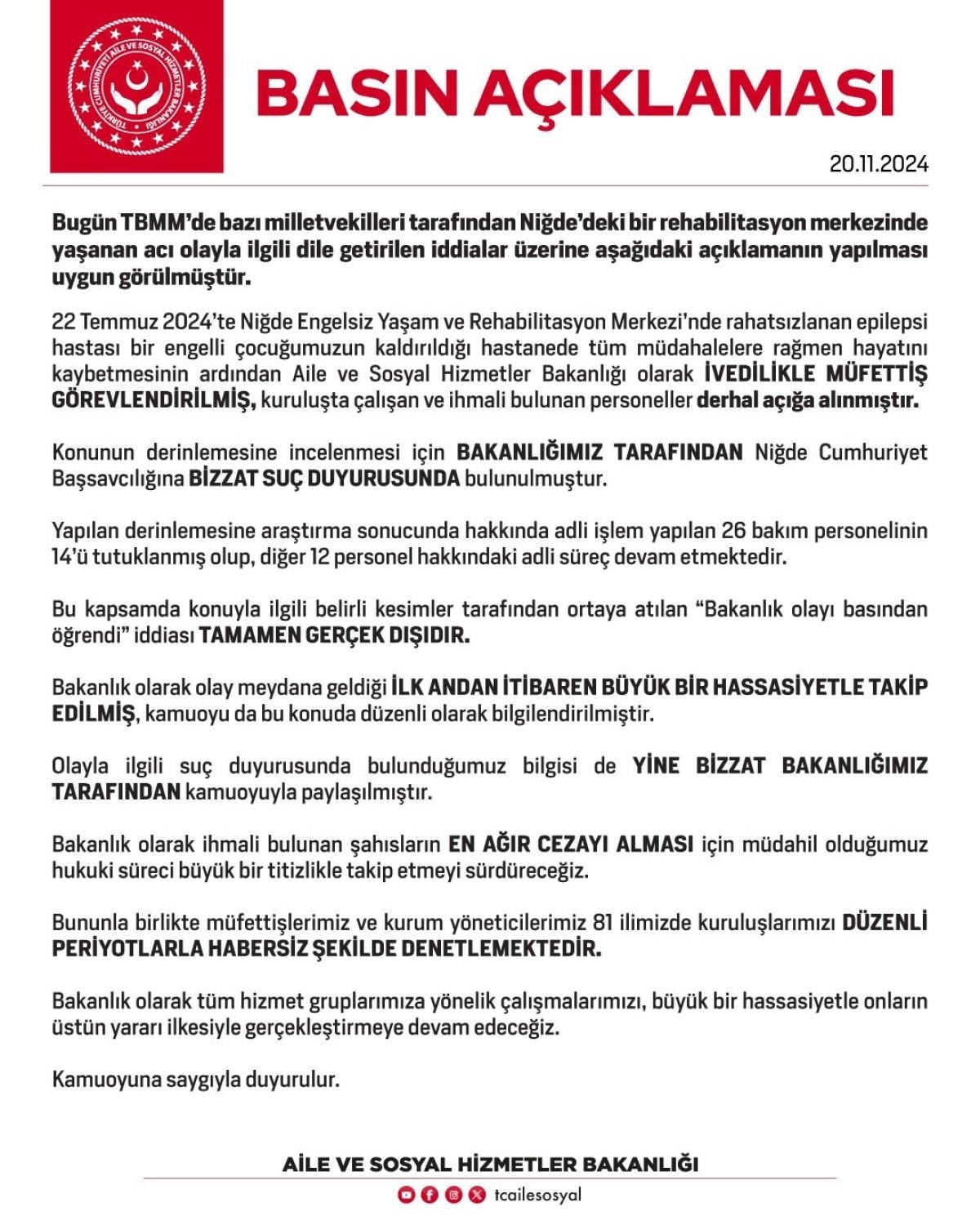 Niğde Engelsiz Yaşam ve Rehabilitasyon Merkezi'nde 22 Temmuz 2024'te rahatsızlanan epilepsi hastası engelli çocuğun kaldırıldığı hastanede tüm müdahalelere rağmen hayatını kaybettiği hatırlatılan açıklamada, Aile ve Sosyal Hizmetler Bakanlığının olayla ilgili hızla müfettiş görevlendirdiği, kuruluşta çalışan ve ihmali bulunan personelin ise derhal açığa alındığı kaydedildi.
