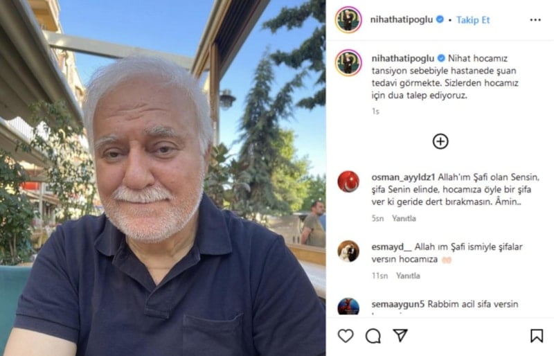 Hatipoğlu'nun sosyal medya hesabından yapılan açıklamada, "Nihat hocamız tansiyon sebebiyle hastanede şu an tedavi görmekte. Sizlerden hocamız için dua talep ediyoruz" ifadeleri kullanıldı.