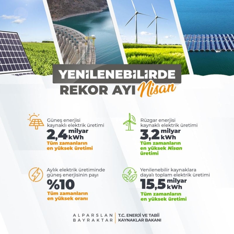 Böylece geçen ay güneş enerjisinden üretilen elektriğin toplam elektrik üretimi içindeki payının yüzde 10'a ulaştığını ve rüzgardan elektrik üretiminin de rekor kaydettiğini aktaran Bayraktar, "Nisanda 3,2 milyar kilovatsaat değeriyle nisan ayları içerisinde tüm zamanların en yüksek rüzgar kaynaklı elektrik üretim seviyesine ulaştık." ifadesini kullandı.