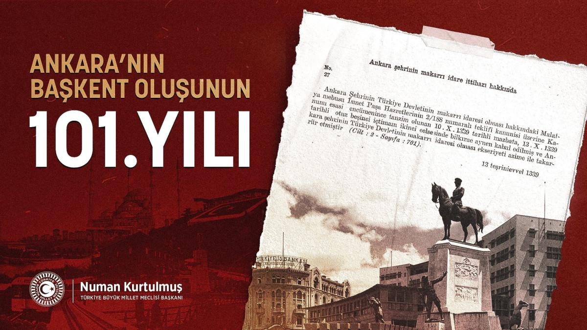 TBMM Başkanı Numan Kurtulmuş, Ankara'nın başkent oluşunun 101. yıl dönümü dolayısıyla sosyal medya hesabı üzerinden bir kutlama mesajı yayınladı.