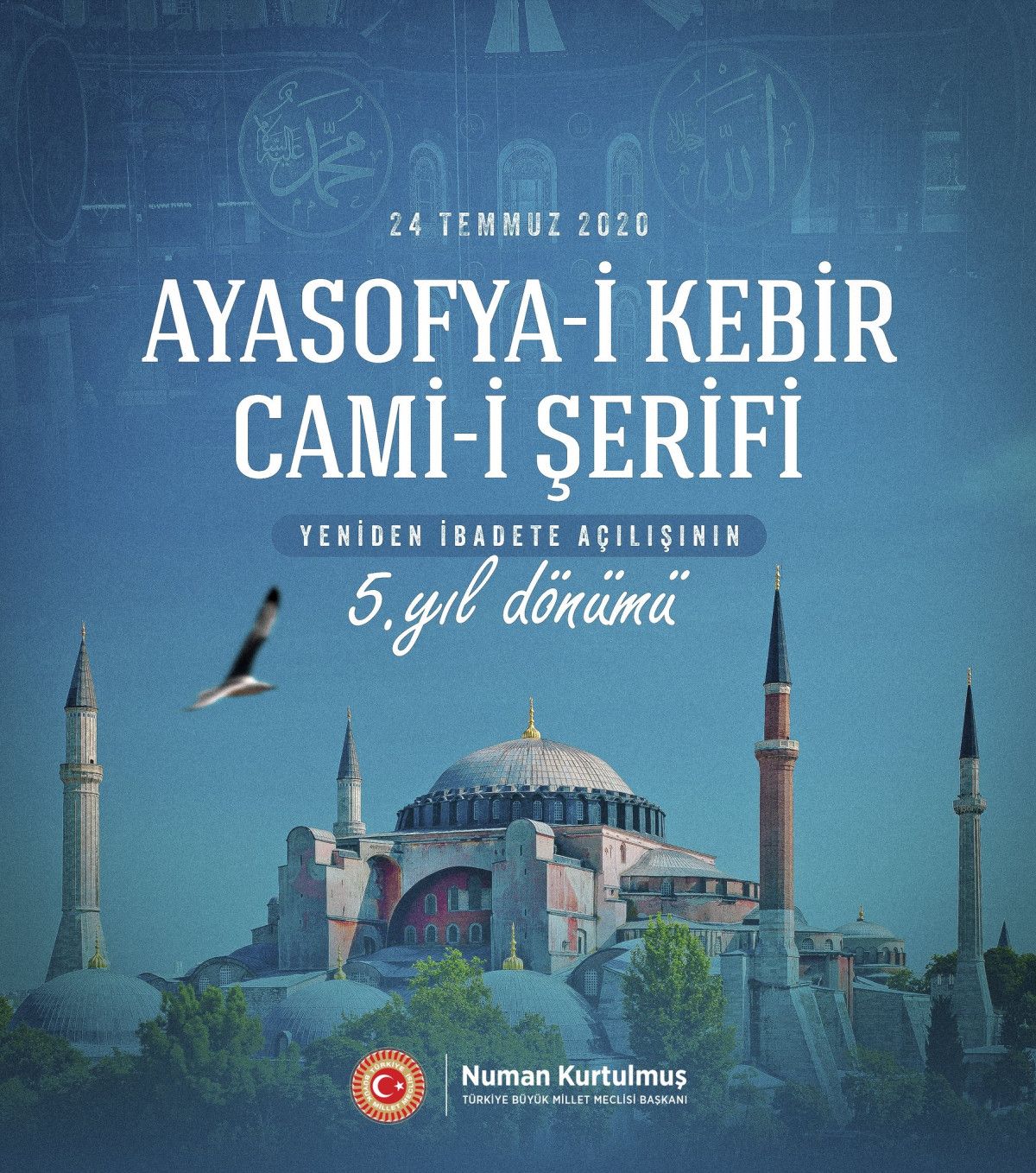 Son olarak TBMM Başkanı Numan Kurtulmuş, Ayasofya-i Kebir Cami-i Şerifi'nin ibadete açılışının 5'inci yıl dönümü dolayısıyla paylaşımda bulundu.