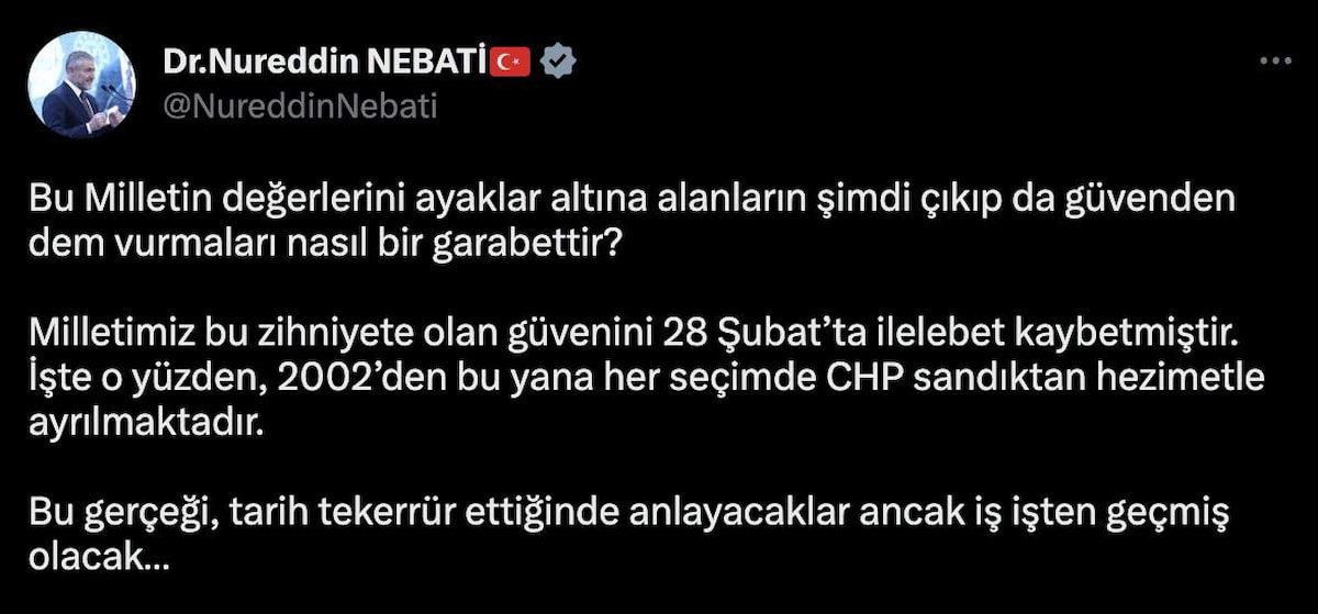 CHP'nin 28 Şubat zulmünü hatırlatan Nebati, Türk halkının o tarihte CHP'ye güvenini kaybettiğini savundu.