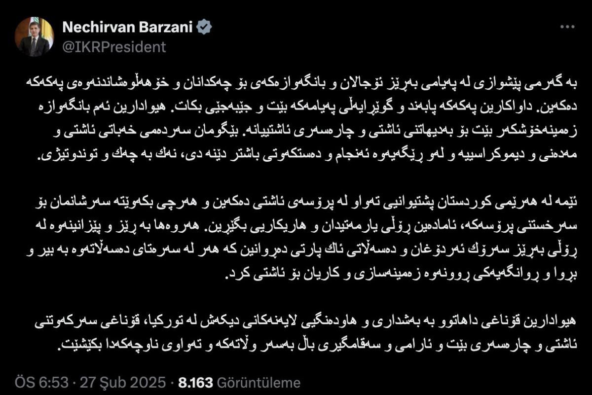 Öcalan'ın silah bırakma çağrısının ardından bir açıklamada Irak Kürt Bölgesel Yönetimi Başkanı Neçirvan Barzani'den geldi.