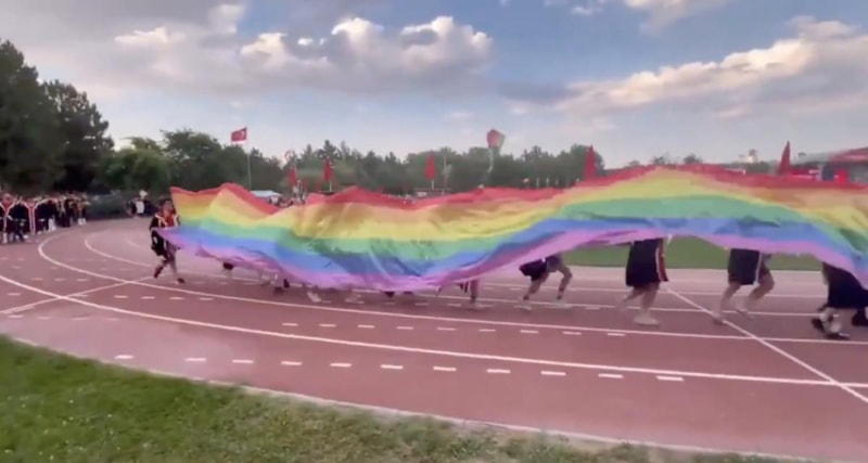 Mezuniyet töreninde sahneye çıkan ve ellerinde LGBT bayrakları olan öğrenciler, koşarak bayrağı tüm sahnede açmaya çalıştı.