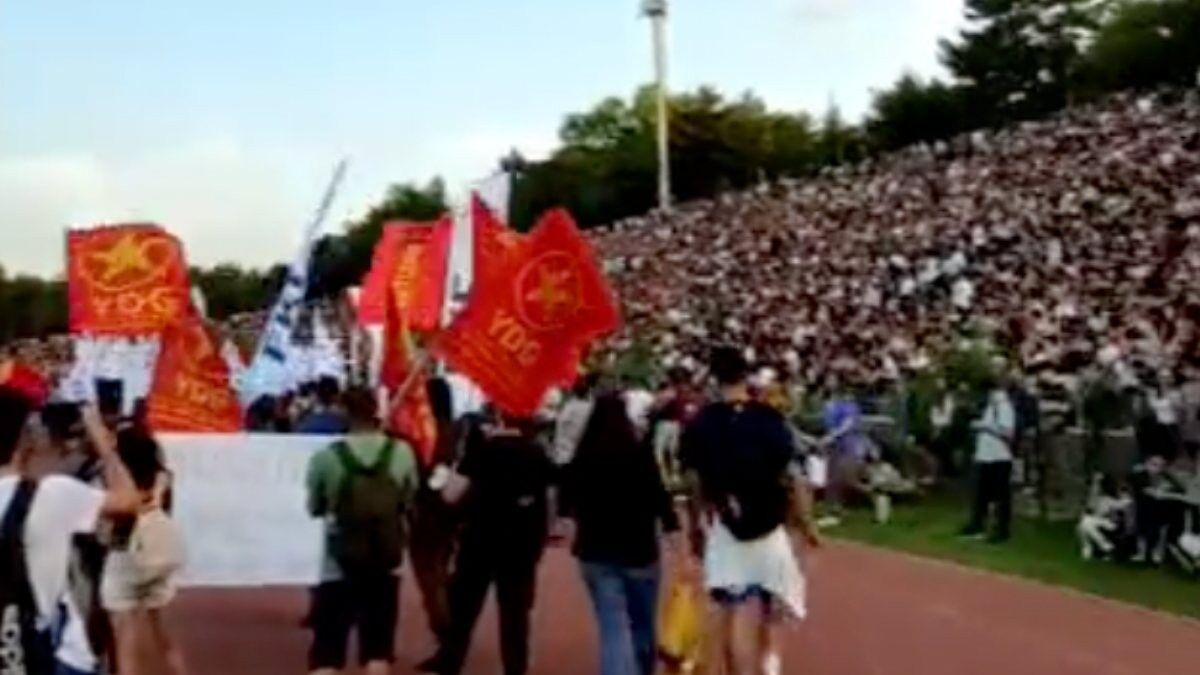Kampüs içindeki Devrim Stadyumu'nda yapılan yürüyüşte yaşanan o skandal anlar cep tepefonu kameralarına yansıdı.