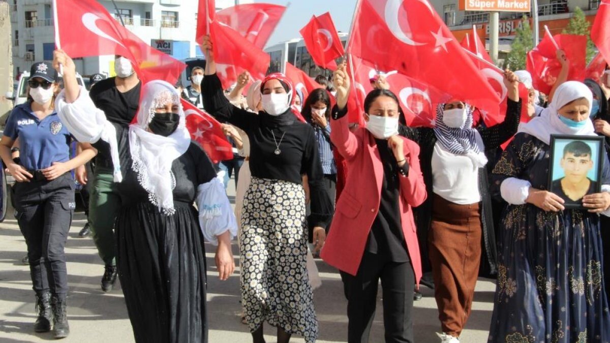 Çocukları terör örgütü PKK mensupları tarafından dağa kaçırılan Şırnak anneleri, yoğun güvenlik önlemleri altında ellerinde Türk bayrakları ve davul zurna eşliğinde HDP il binasına yürüyerek tepkilerini dile getirdiler.