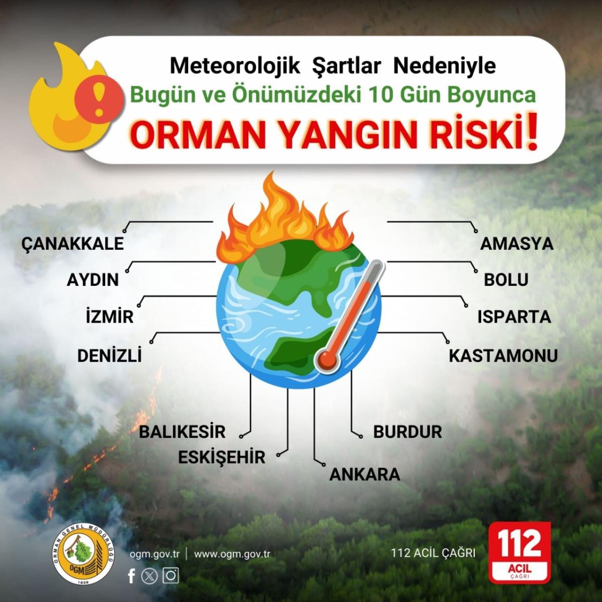 Ankara, Amasya, Aydın, Balıkesir, Bolu, Burdur, Çanakkale, Denizli, Eskişehir, Isparta, İzmir ve Kastamonu illerine meteorolojik şartlar nedeniyle, bugün ve önümüzdeki 10 gün boyunca orman yangını riski konusunda uyarı yapıldı.