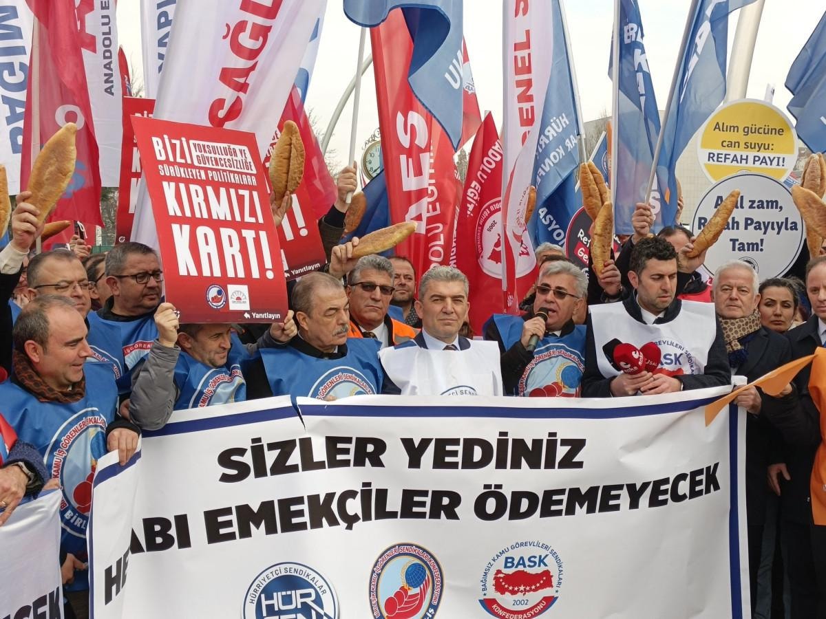 Gelirlerimizin artmaması, aldığımız maaşların yetmemesi nedeniyle refah payı talep ediyoruz. Sabit gelirlilerin kira, elektrik, doğalgaz, gıda ve diğer zorunlu harcamalarının artması sebebiyle kamu görevlileri olarak emeğimizin karşılığını almak için meydanlarda olmaya devam ediyoruz. Son bir yılda doğalgaz yüzde 60, elektrik ve akaryakıt yüzde 40, market-pazar enflasyonu ise en az yüzde 100 artmış durumda. Yılbaşından itibaren ekmeğe yüzde 25 zam geldi. Ev kiraları ise 30 bin-35 bin TL civarına yükseldi ve memurların bu kiraları karşılaması imkânsız hale geldi. Emeğimizin hakkını almak için refah payı şart diyoruz. Taleplerimizi yüksek sesle yineliyoruz.