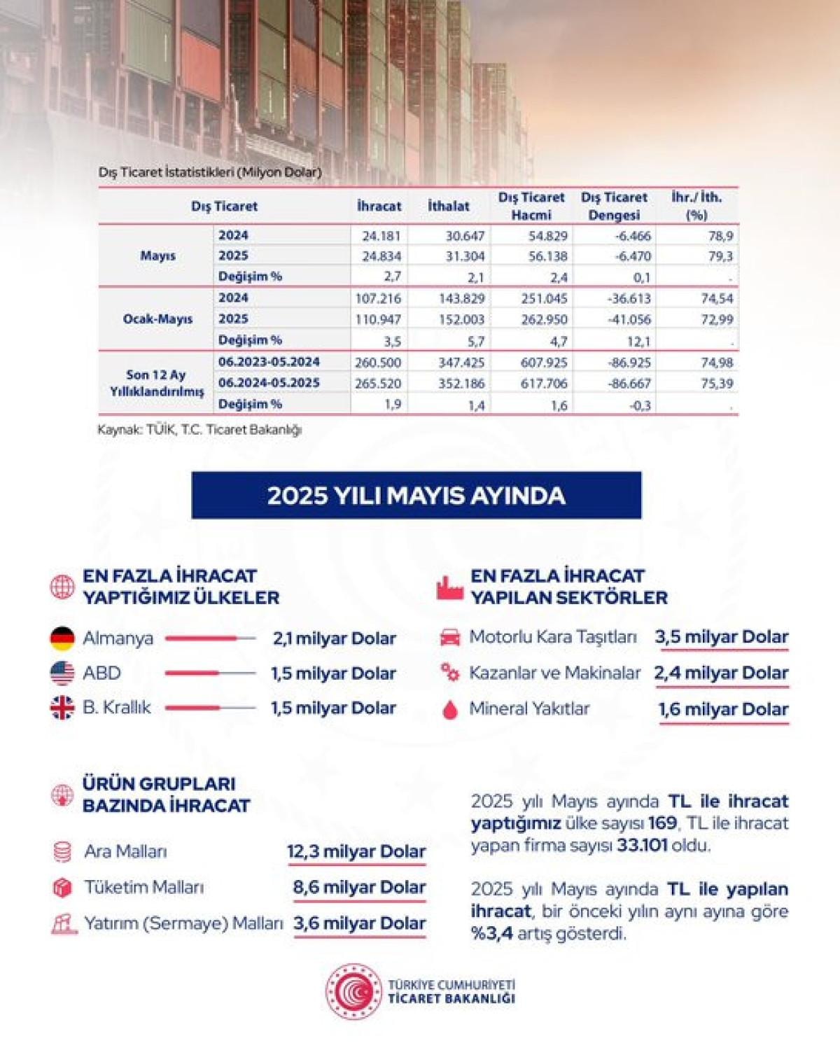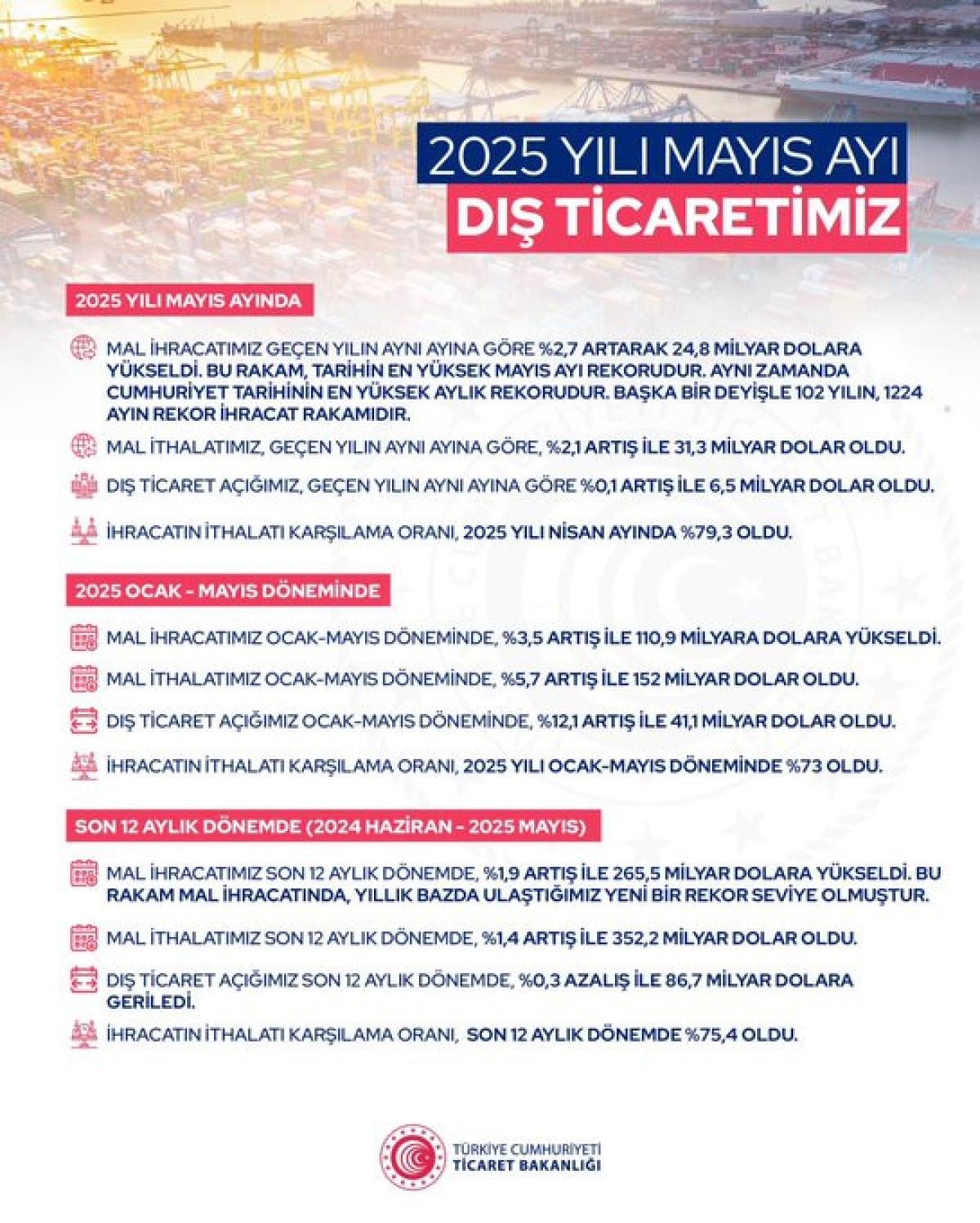 Mayıs'ta ihracat 24,8 milyar dolar oldu. Cumhuriyet tarihimizin aylık mal ihracatı rekoru kırıldı. Avrupa Birliği başta olmak üzere Orta ve Afrika ülkelerinde talepte bir gerileme var.