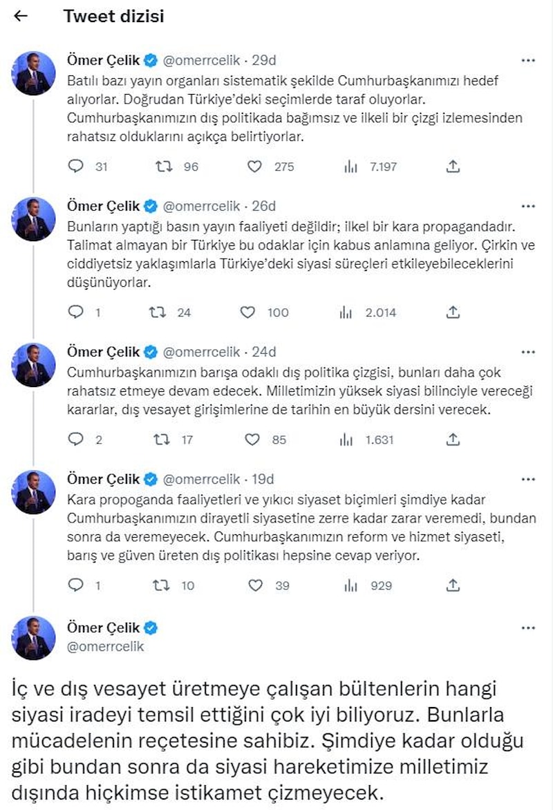 Batılı bazı yayın organları sistematik şekilde Cumhurbaşkanımızı hedef alıyorlar. Doğrudan Türkiye’deki seçimlerde taraf oluyorlar. Cumhurbaşkanımızın dış politikada bağımsız ve ilkeli bir çizgi izlemesinden rahatsız olduklarını açıkça belirtiyorlar.
