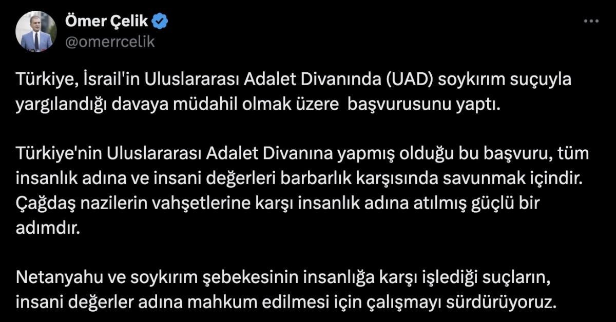 "Türkiye, İsrail'in Uluslararası Adalet Divanında (UAD) soykırım suçuyla yargılandığı davaya müdahil olmak üzere başvurusunu yaptı. Türkiye'nin Uluslararası Adalet Divanına yapmış olduğu bu başvuru, tüm insanlık adına ve insani değerleri barbarlık karşısında savunmak içindir. Çağdaş Nazilerin vahşetlerine karşı insanlık adına atılmış güçlü bir adımdır. Netanyahu ve soykırım şebekesinin insanlığa karşı işlediği suçların, insani değerler adına mahkum edilmesi için çalışmayı sürdürüyoruz”