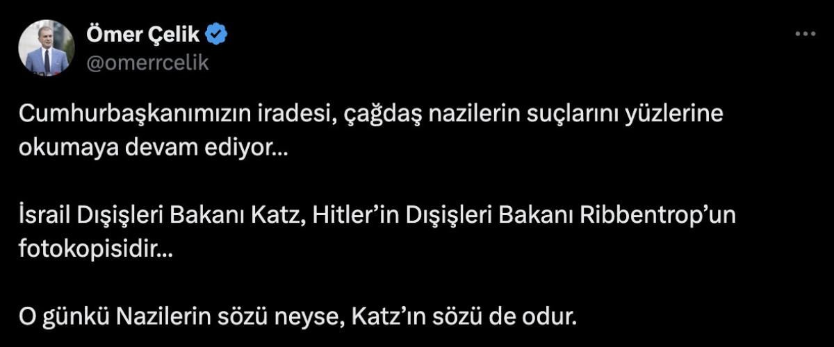 AK Parti Sözcüsü ve Genel Başkan Yardımcısı Ömer Çelik, Katz'ın, Cumhurbaşkanı Recep Tayyip Erdoğan'a yönelik paylaşımına tepki gösterdi.