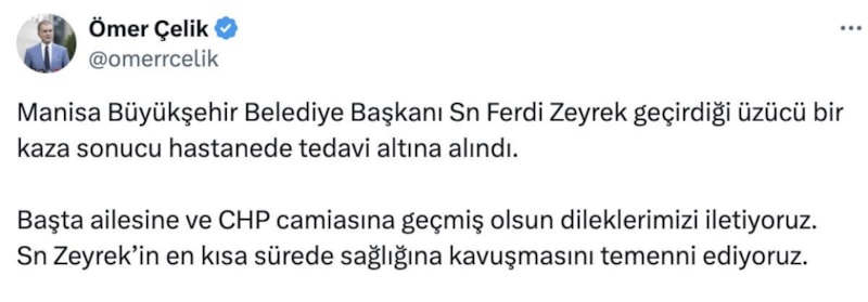 AK Parti Sözcüsü Ömer Çelik, yoğun bakımda tedavisi süren Ferdi Zeyrek'e ilişkin geçmiş olsun mesajı yayınladı.