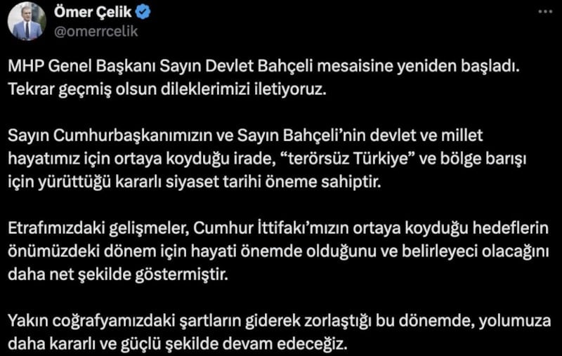 Çelik, sosyal medya platformu X üzerinden Bahçeli'nin sağlık durumuna ilişkin açıklamalarda bulundu.
