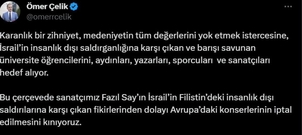 Sn Fazıl Say’ın masum sivillere sahip çıkan, Netenyahu’nun canice siyasetine karşı olan, herkes kesime dönük hakkaniyetli bir çözüm için gayret gösteren Sn Cumhurbaşkanımızın barıştan yana olan yaklaşımını desteklemesi takdir edilmesi gereken bir tavırdır.