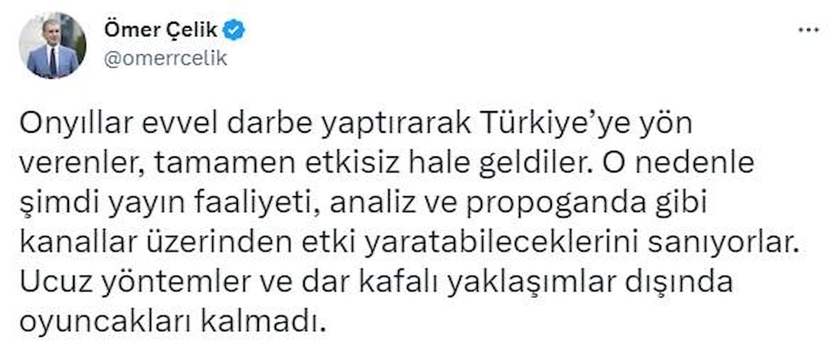 Onyıllar evvel darbe yaptırarak Türkiye’ye yön verenler, tamamen etkisiz hale geldiler. O nedenle şimdi yayın faaliyeti, analiz ve propoganda gibi kanallar üzerinden etki yaratabileceklerini sanıyorlar. Ucuz yöntemler ve dar kafalı yaklaşımlar dışında oyuncakları kalmadı.