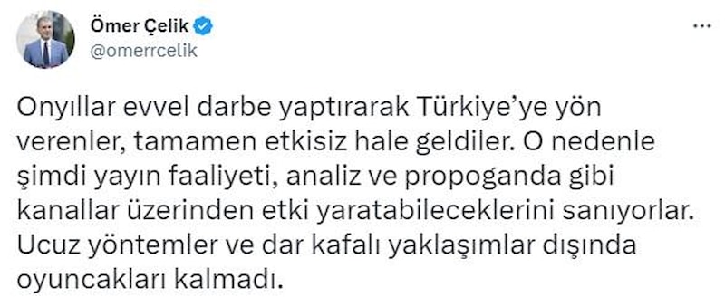 "Cumhurbaşkanımızın dirayetli siyaseti ve milletimizin iradesi bu şebekelere gerekli cevabı vermeye devam ediyor" diyen Çelik, şu ifadeleri kullandı: