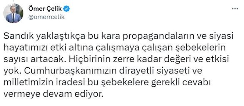 "Sandık yaklaştıkça bu kara propagandaların ve siyasi hayatımızı etki altına çalışmaya çalışan şebekelerin sayısı artacak. Hiçbirinin zerre kadar değeri ve etkisi yok. Cumhurbaşkanımızın dirayetli siyaseti ve milletimizin iradesi bu şebekelere gerekli cevabı vermeye devam ediyor.