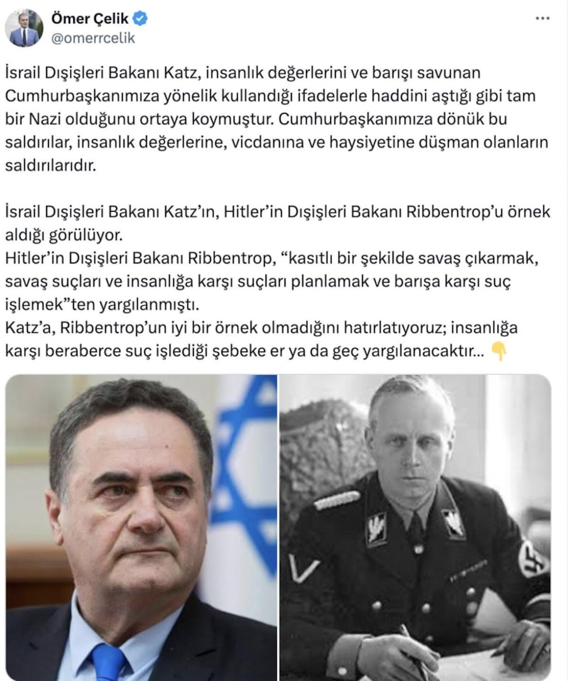 İsrail Dışişleri Bakanı Katz'a tepki gösteren Ömer Çelik, "İsrail Dışişleri Bakanı Katz’ın, Hitler’in Dışişleri Bakanı Ribbentrop’u örnek aldığı görülüyor" dedi.