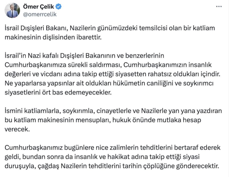 AK Parti Sözcüsü Ömer Çelik, İsrail Dışişleri Bakanı Katz'a sosyal medya hesabından yaptığı paylaşımda sert tepki gösterdi.