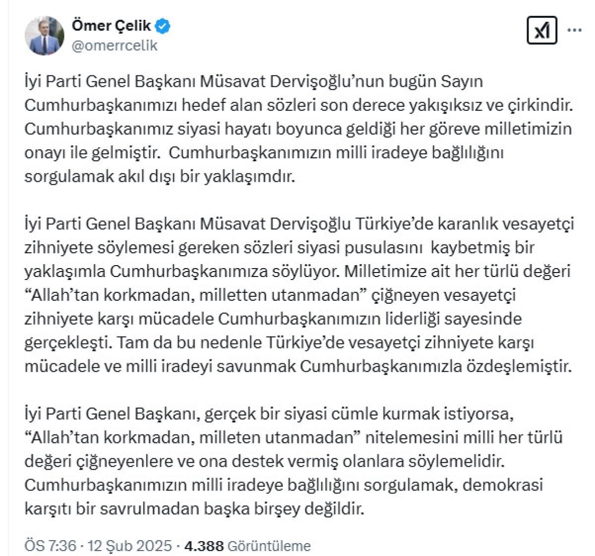 AK Parti Sözcüsü Ömer Çelik, İyi Parti Genel Başkanı Müsavat Dervişoğlu'nun Cumhurbaşkanı Recep Tayyip Erdoğan'ı hedef alan sözlerine tepki gösterdi.