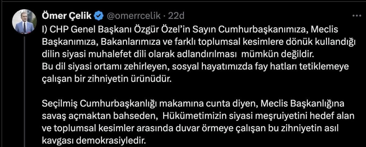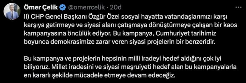CHP Genel Başkanı Özgür Özel’in açıklamalarına ilişkin Ömer Çelik'ten dikkat çeken bir paylaşım geldi.