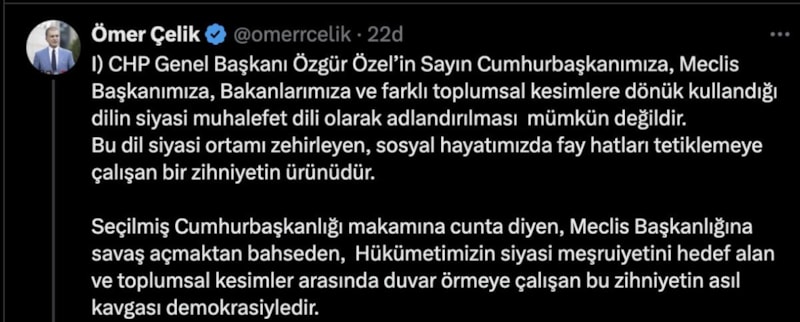 Sosyal medya platformu X üzerinden paylaşımda bulunan Çelik, Özel'in siyasi alanı çatışmaya dönüştürmeye çalışan bir kaos kampanyasına öncülük ettiğini belirterek, "Bu dil siyasi ortamı zehirleyen, sosyal hayatımızda fay hatları tetiklemeye çalışan bir zihniyetin ürünüdür." ifadesinde bulundu.