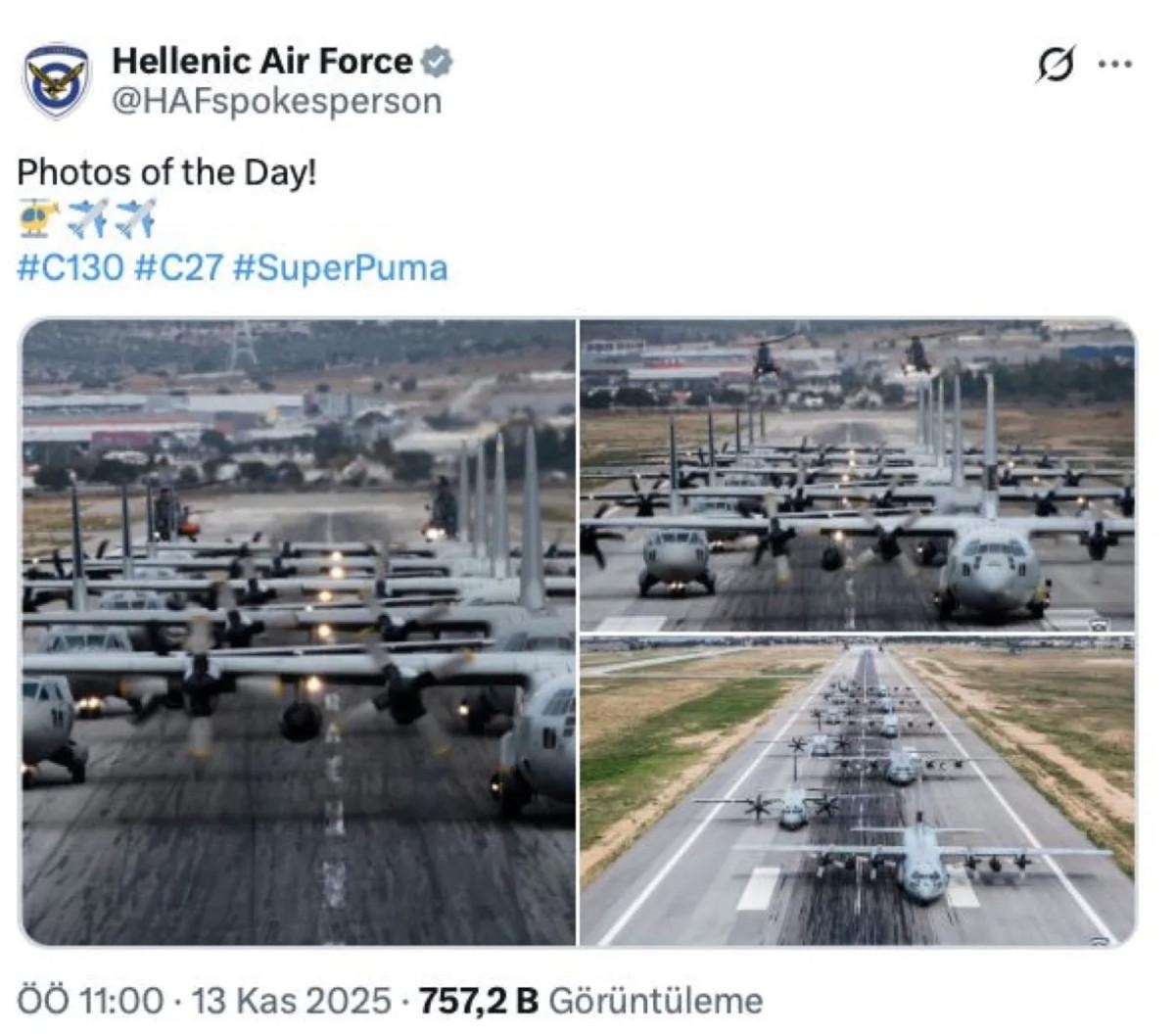 Resmi hesaptan yapılan paylaşımda, C-130 filosunun görsellerine yer verilerek “Günün Fotoğrafları! #C130 #C27 #SuperPuma” notu düşüldü.