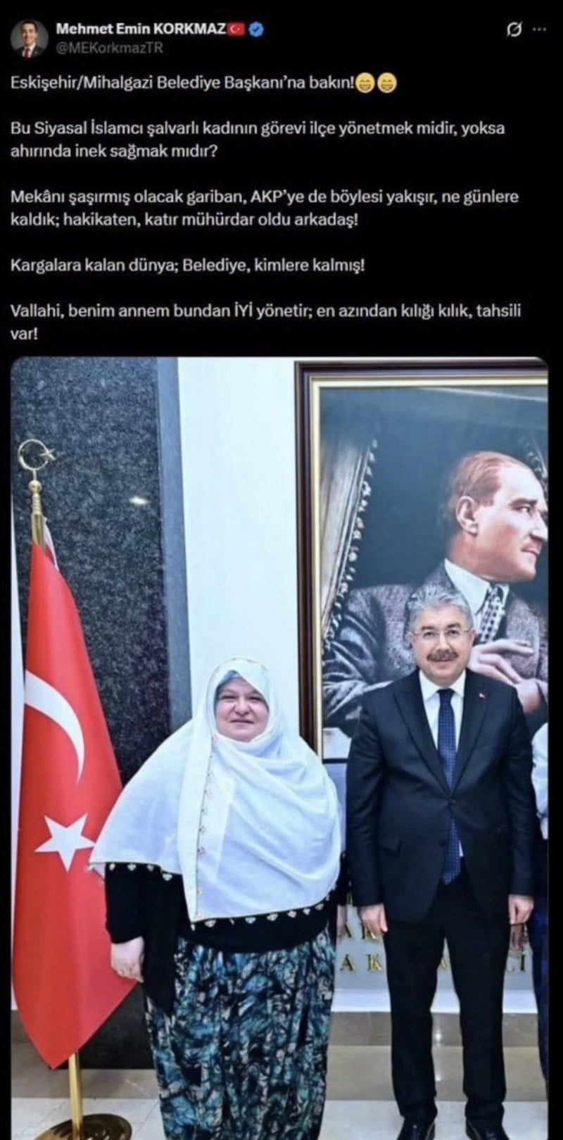 İyi Partili Mehmet Emin Korkmaz'ın dün akşam saatlerinde yaptığı paylaşımda, "Eskişehir/Mihalgazi Belediye Başkanı'na bakın! Bu siyasal İslamcı şalvarlı kadının görevi ilçe yönetmek midir, yoksa ahırında inek sağmak mıdır? Mekanı şaşırmış olacak gariban, AK Parti'ye de böylesi yakışır. Ne günlere kaldık? Hakikaten katır mühürdar oldu arkadaş! Kargalara kalan dünya, belediye kimlere kalmış? Vallahi benim annem bundan iyi yönetir. En azından kılığı kılık, tahsili var." ifadeleri yer aldı.