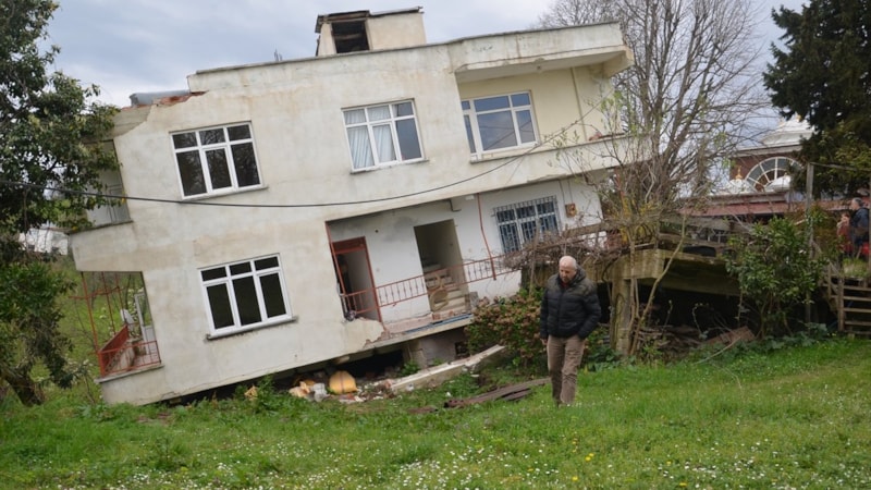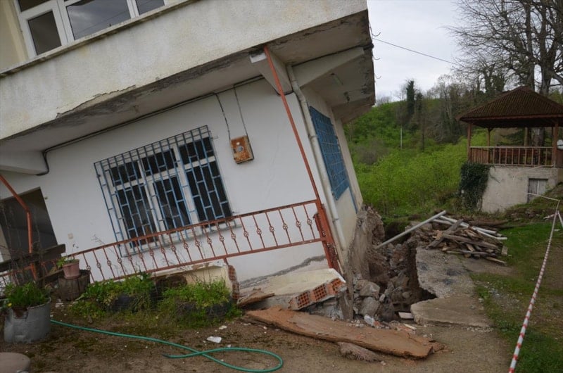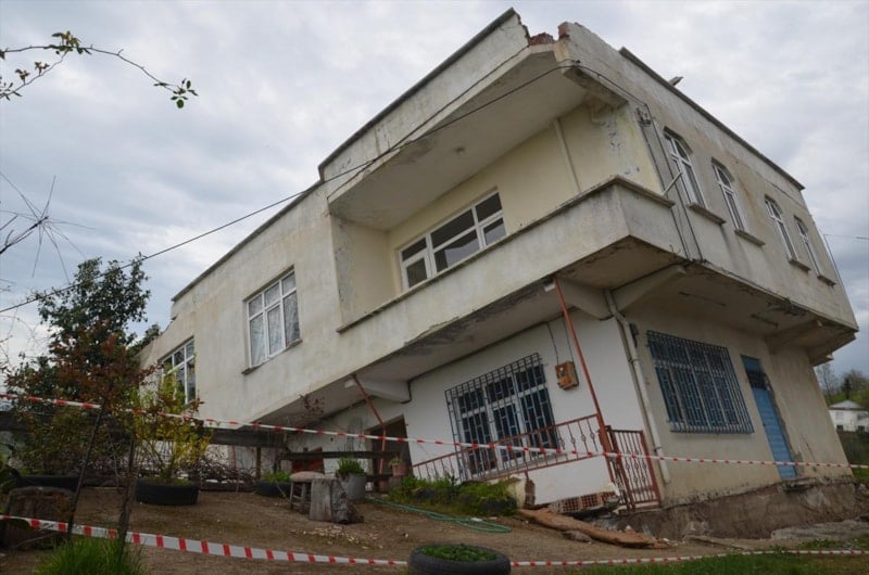 Kentte yaklaşık 4 yıl önce heyelan nedeniyle 10 binanın boşaltıldığı bölgede, 2 katlı binanın yeniden yaşanan heyelan sonrası yan yatması üzerine çevrede yeniden önlemler alındı.
