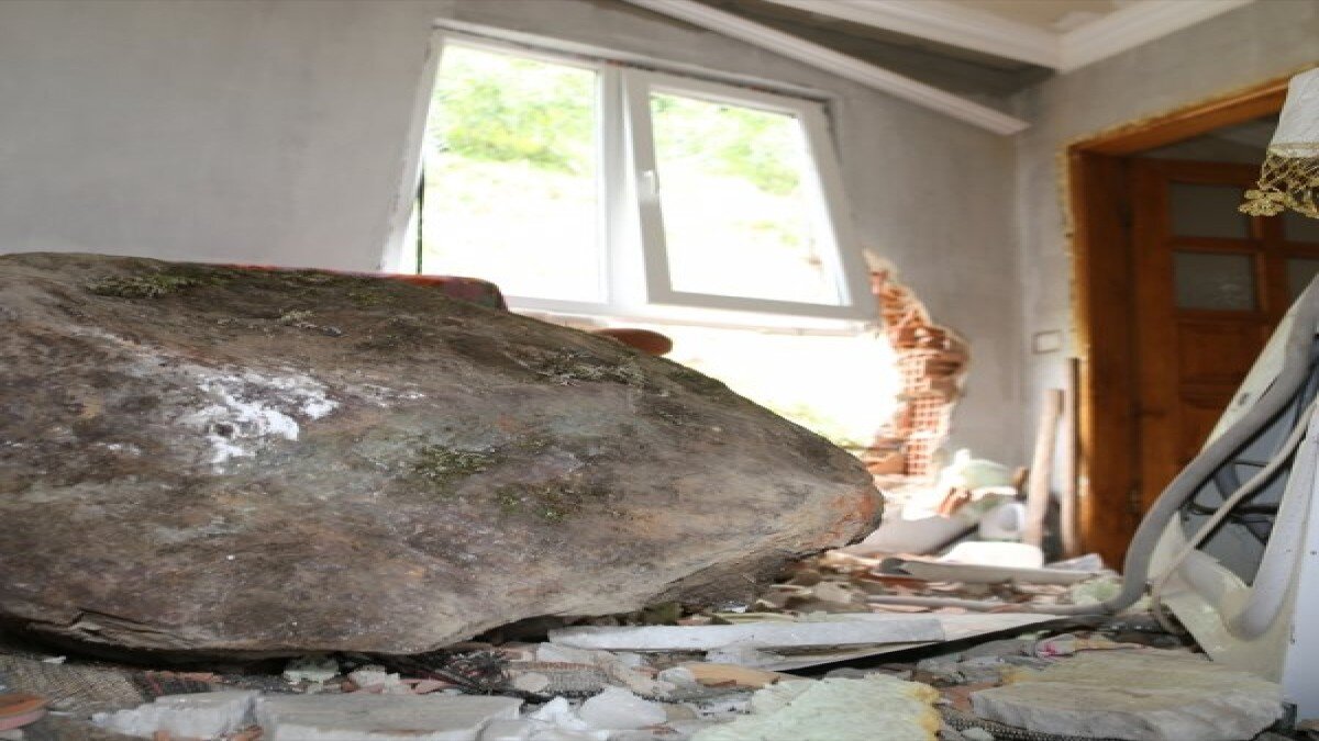 Ordu'da ilçeye bağlı Hürriyet Mahallesi Akbulut mevkisine 500 metre mesafedeki yamaçtan koparak yuvarlanan yaklaşık 1 tonluk kaya parçası, Aydın Otur ve ailesinin yaşadığı evin duvarını yıktı.
