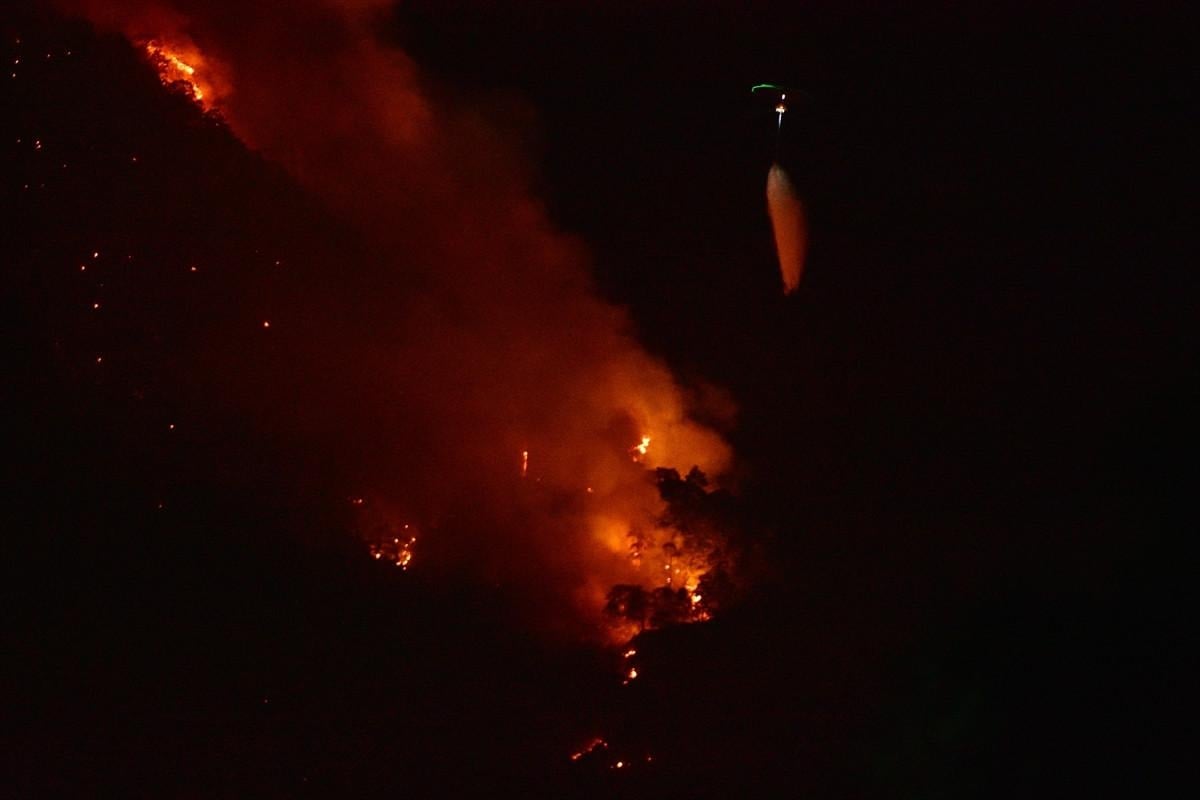 Karadan ulaşımın güçlükle sağlandığı bölgede, gün boyunca yangına müdahale eden 10 uçak, 27 helikopter, havanın kararmasıyla çalışmalara ara verdi.