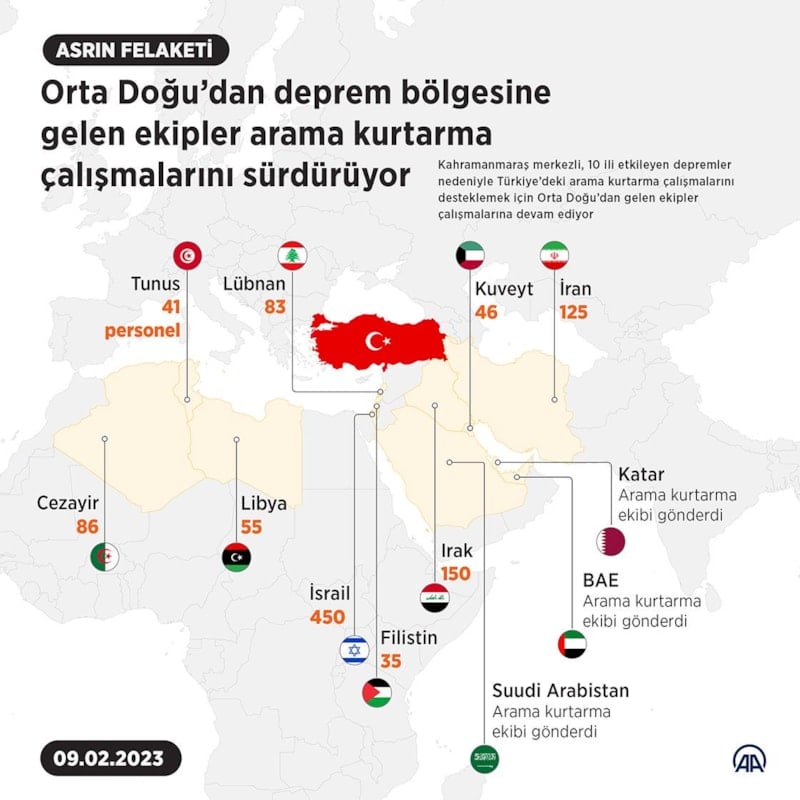 Kahramanmaraş merkezli, 10 ili etkileyen 7.7 ve 7.6 büyüklüğündeki depremler nedeniyle Türkiye’deki arama kurtarma çalışmalarını desteklemek için Orta Doğu’dan gelen ekipler çalışmalarını sürdürüyor.
