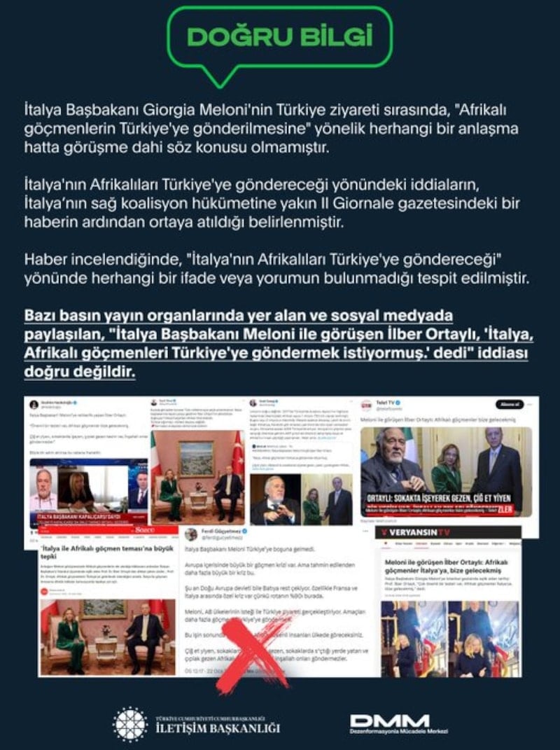 İtalya Başbakanı Giorgia Meloni'nin Türkiye ziyareti sırasında, "Afrikalı göçmenlerin Türkiye'ye gönderilmesine" yönelik herhangi bir anlaşma hatta görüşme dahi söz konusu olmamıştır.