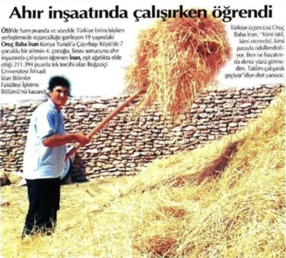 Oruç Baba İnan, 2000 yılındaki üniversiteye giriş sınavlarında birinci olarak Türkiye'ye adını duyurmuştu.