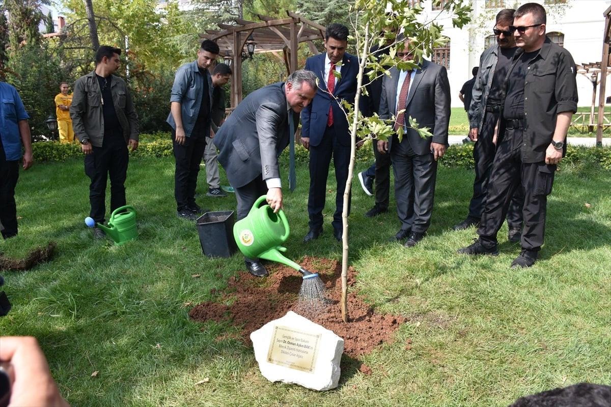 Kurum amirleri ve diğer ilgililerle selamlaşan Bak, ziyaret anısına Valilik bahçesine çınar fidanı dikerek can suyu verdi.